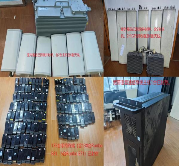 执法人员经监测定位,确定不明信号由涉案单位厂区内发出。通过对该单位进行现场检查,执法人员发现其在厂区内设置、使用某品牌基站2套及各型号手持对讲机135台。执法人员使用便携式监测设备现场监测确认,以上设备均运行于1790-1800MHz频段。经询问该单位现场负责人并通过浙江省经济和信息化厅网上统一审批平台确认,上述设备及频率均未取得相应的用频设台许可。