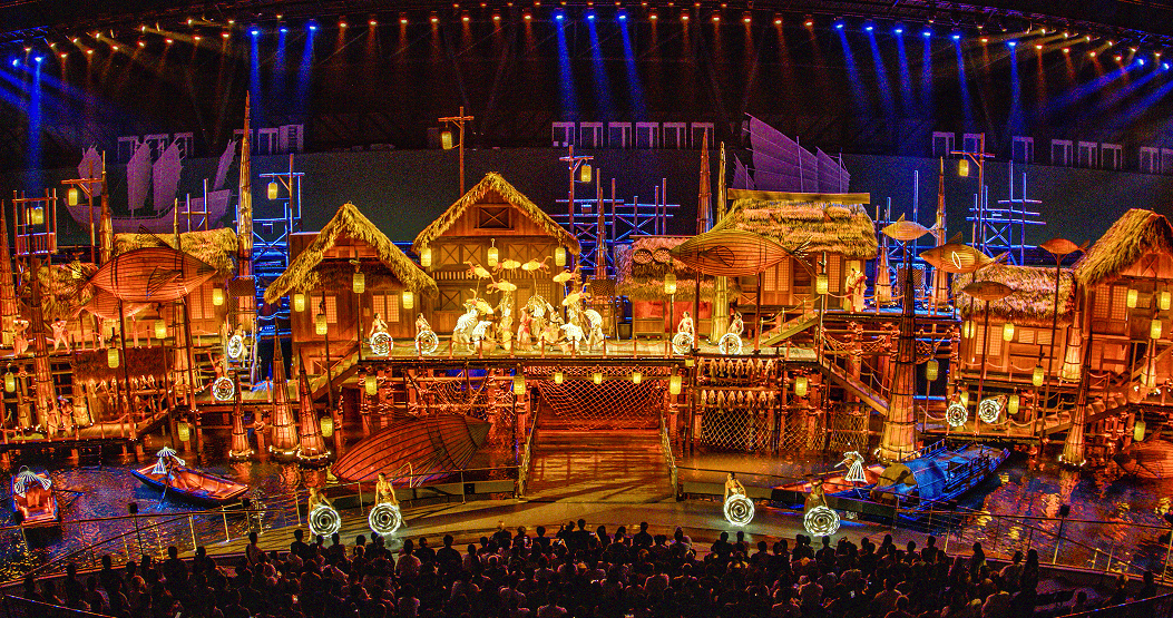 这场秀以船为载体,串起海洋文化、齐鲁民俗与商贸传奇,搭配120米环形舞台、旋转观众席和海浪模拟系统,为观众打造“入场即入海”的沉浸式体验。