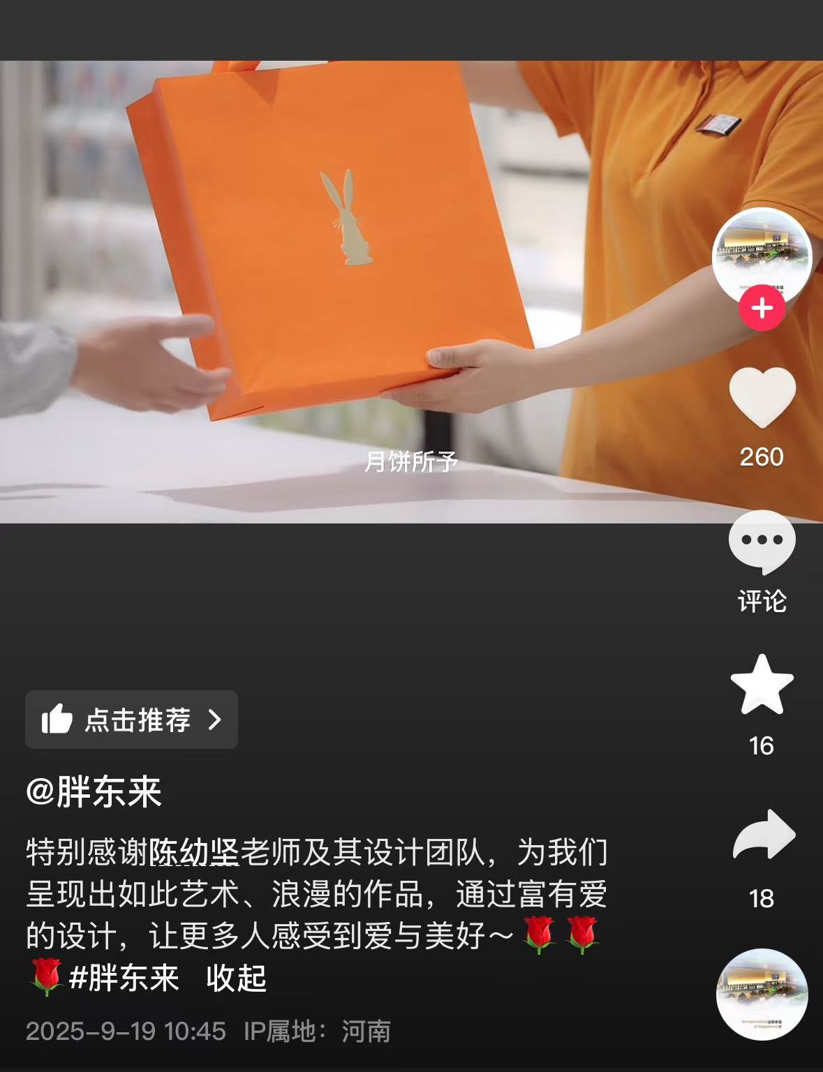 9月19日,胖东来官方账号曾发布作品,介绍自营月饼包装盒由中国香港陈幼坚团队设计。此外,工作人员还表示赏月礼盒系列(即包装盒是会跳动的兔子款)已经断货了,补货时间无法确定。据胖东来官方文件显示,DL自营月饼礼盒每盒售价97元至350元不等。