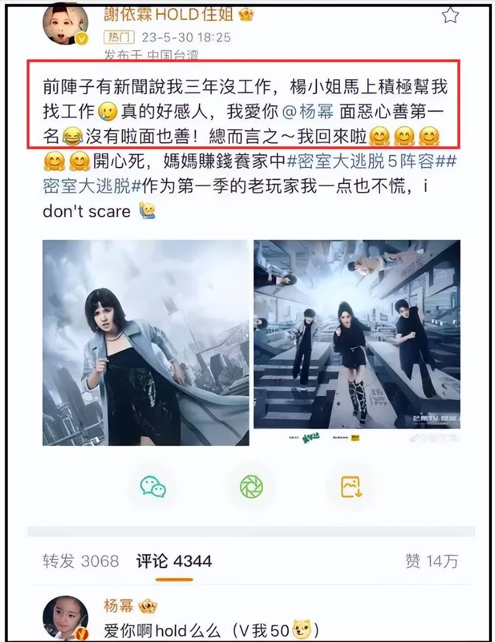 另一方面,谢依霖自从结婚生孩子后,就多次卖惨,透露丈夫患上肌无力,娘家也没有什么依靠,经济情况很糟糕。当她在节目里公开说这一切时,作为好友的杨幂立刻提供了工作机会。